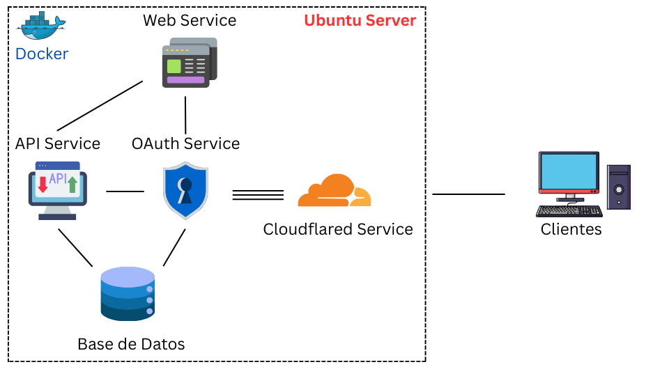 Infraestructura y CI/CD: Cada proyecto tiene su propio Dockerfile y repositorio en GitHub. Al hacer push a la rama principal, GitHub Actions ejecuta un pipeline que construye la imagen Docker y la publica en Docker Hub. En el servidor Ubuntu 24.04.03, un GitHub Runner self-hosted ejecuta automáticamente el docker-compose pull y restart para desplegar las nuevas versiones.